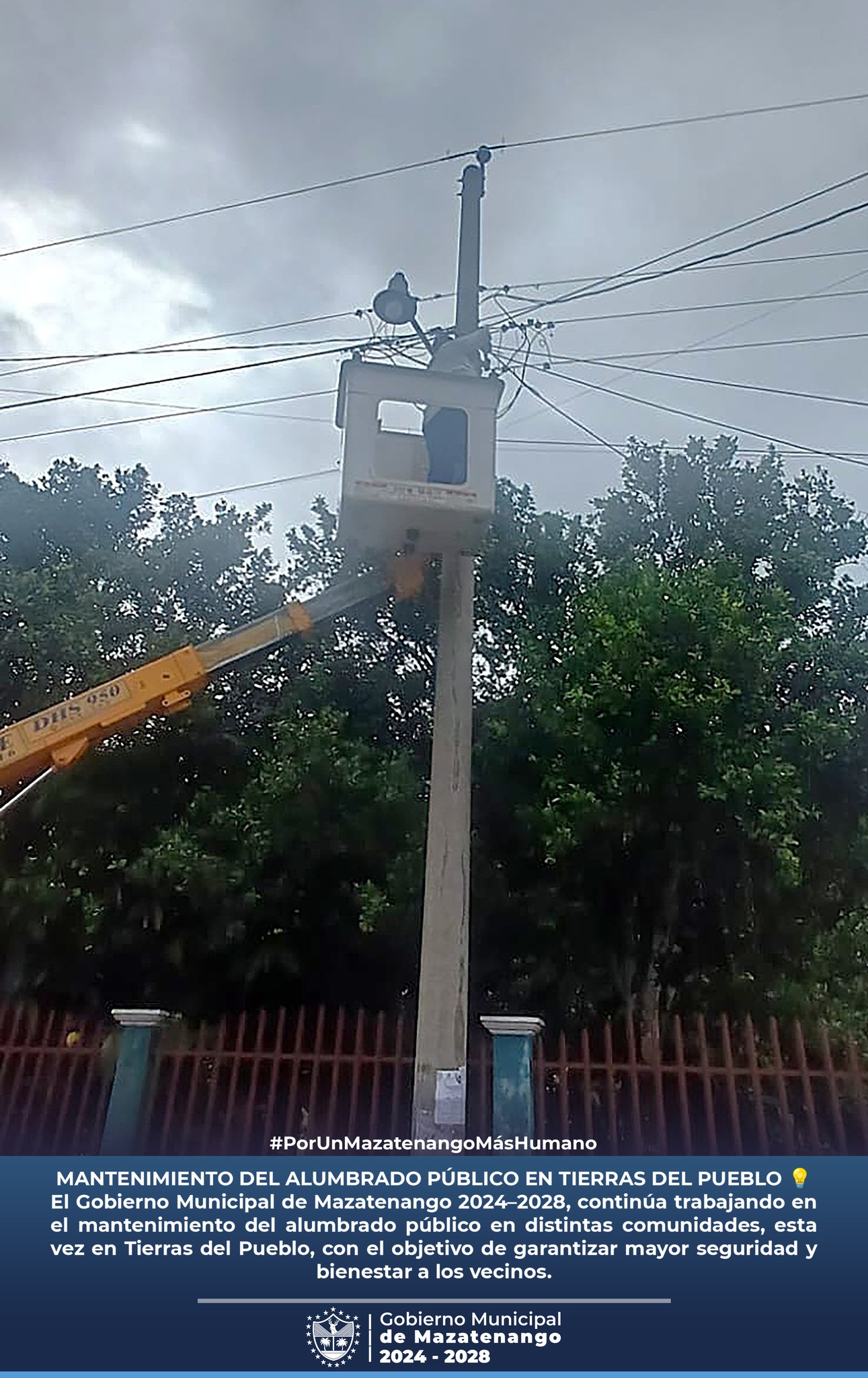 El Gobierno Municipal de Mazatenango 2024–2028, continúa trabajando en el mantenimiento del alumbrado público en distintas comunidades, esta vez en Tierras del Pueblo, con el objetivo de garantizar mayor seguridad y bienestar a los vecinos.