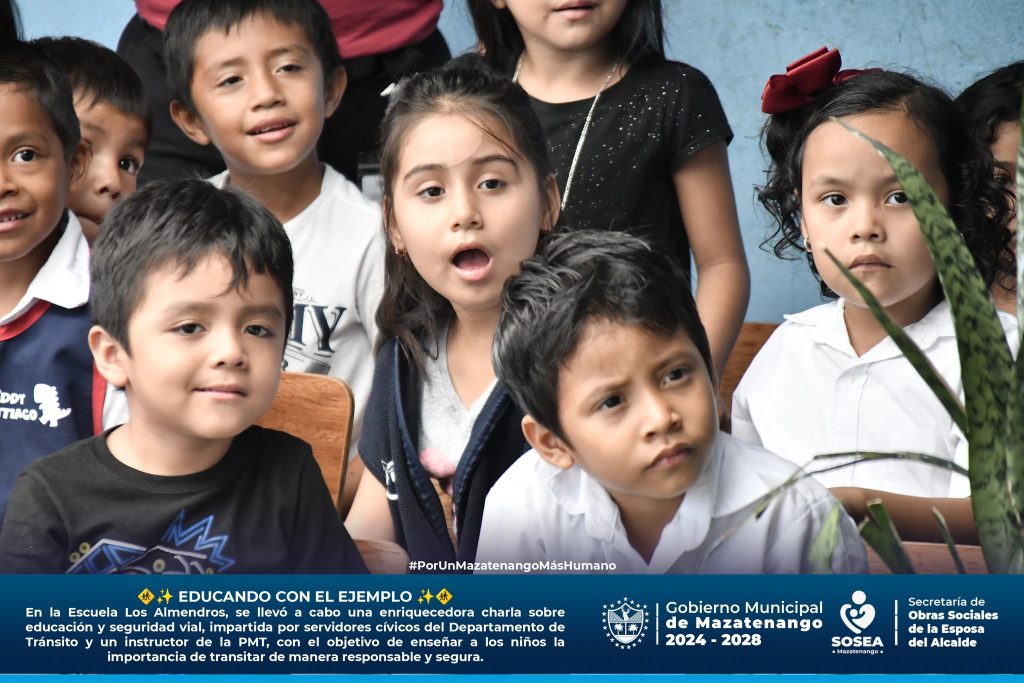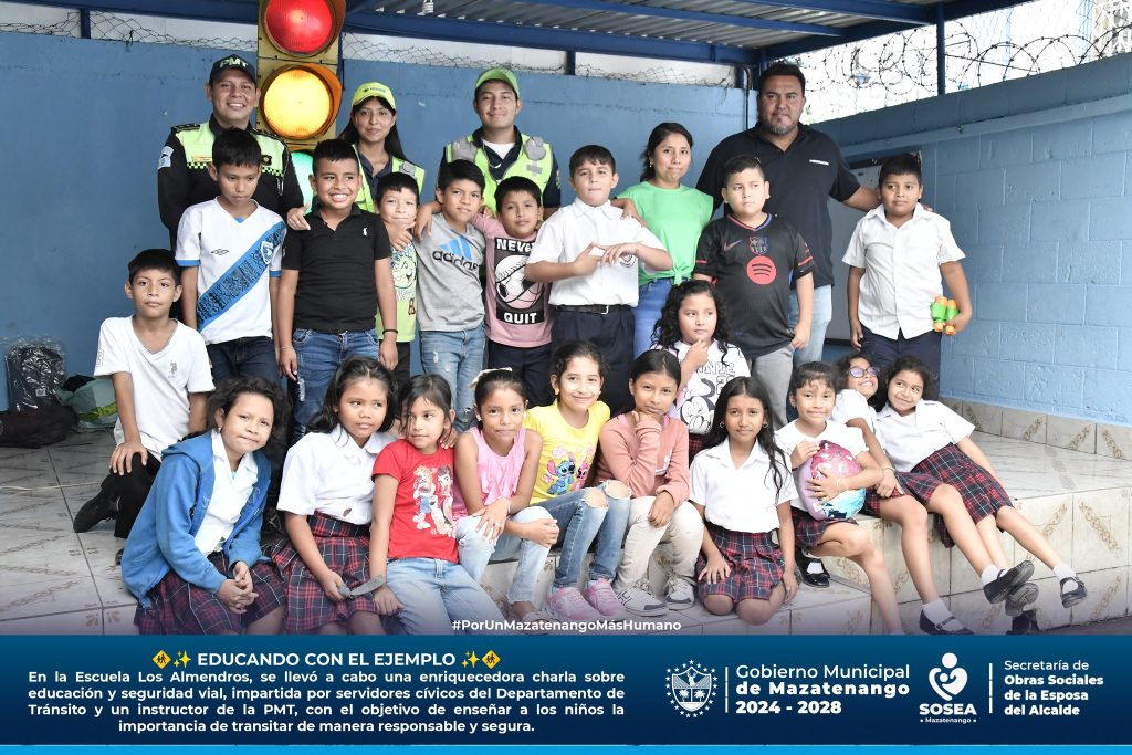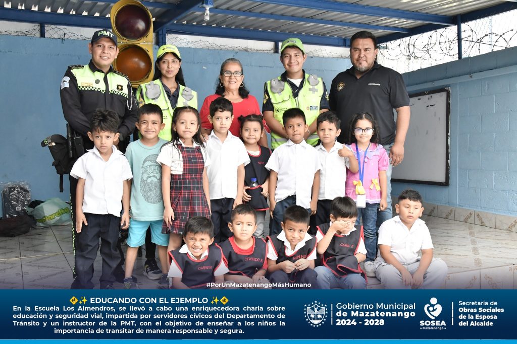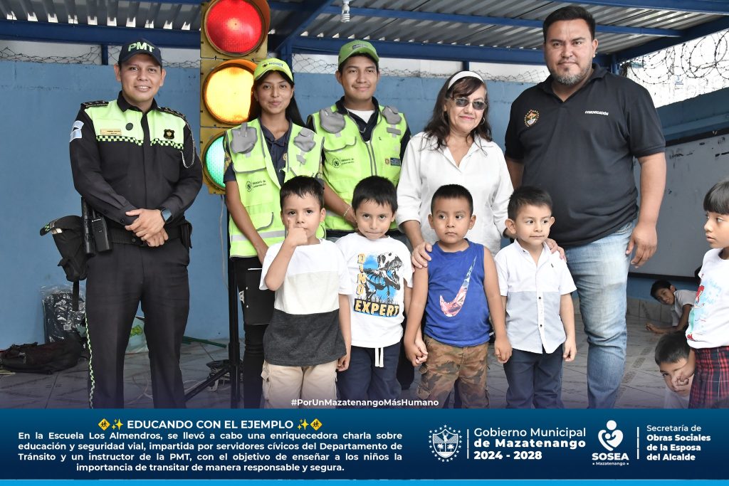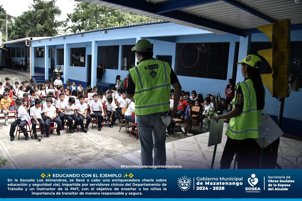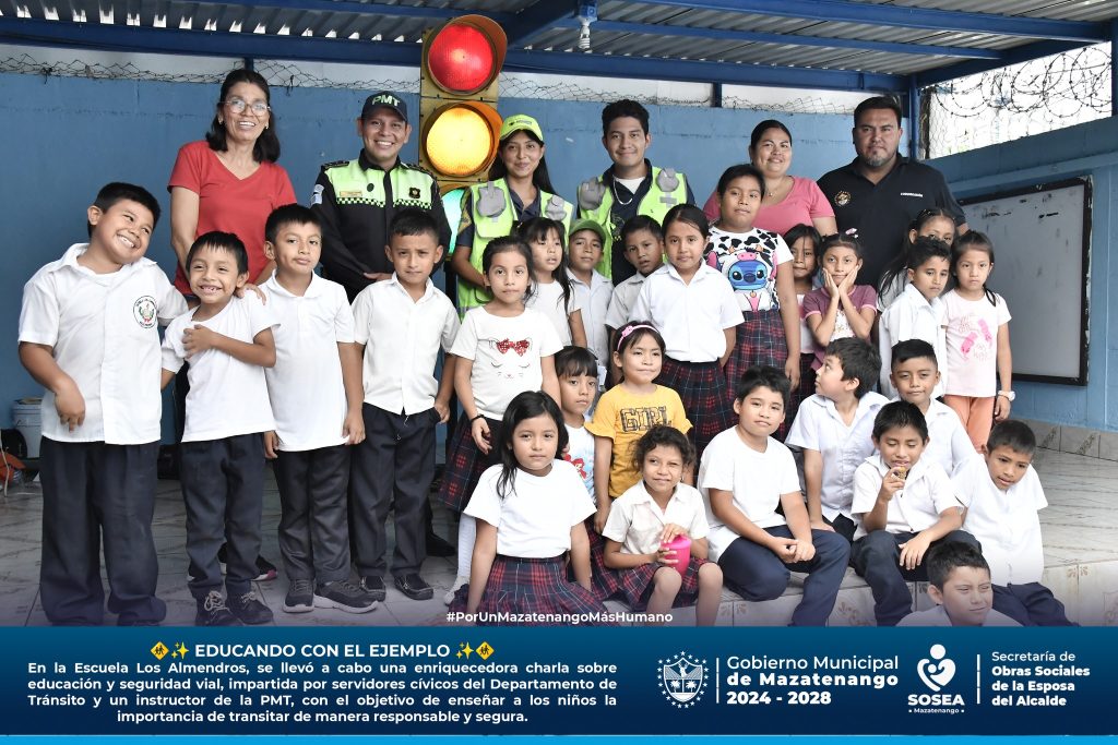 En la Escuela Los Almendros, se llevó a cabo una enriquecedora charla sobre educación y seguridad vial, impartida por servidores cívicos del Departamento de Tránsito y un instructor de la PMT, con el objetivo de enseñar a los niños la importancia de transitar de manera responsable y segura.