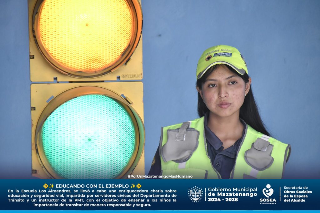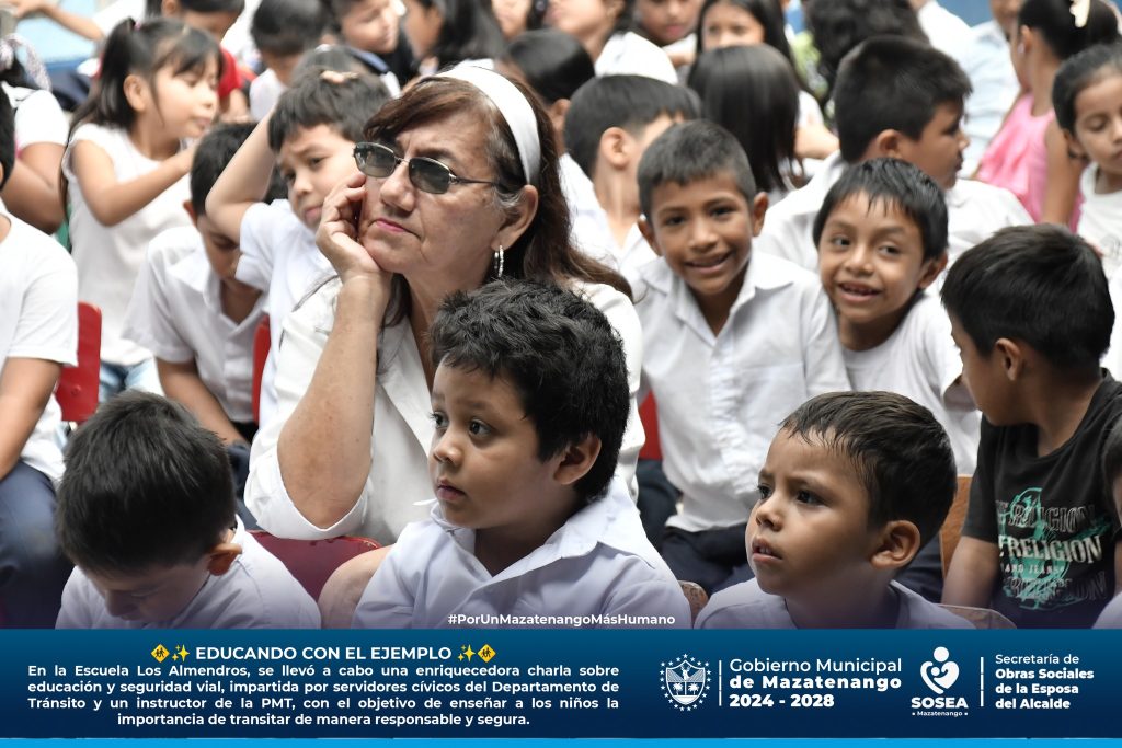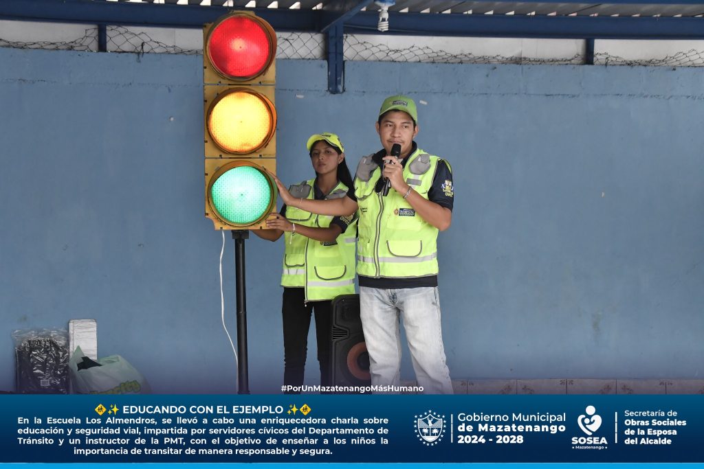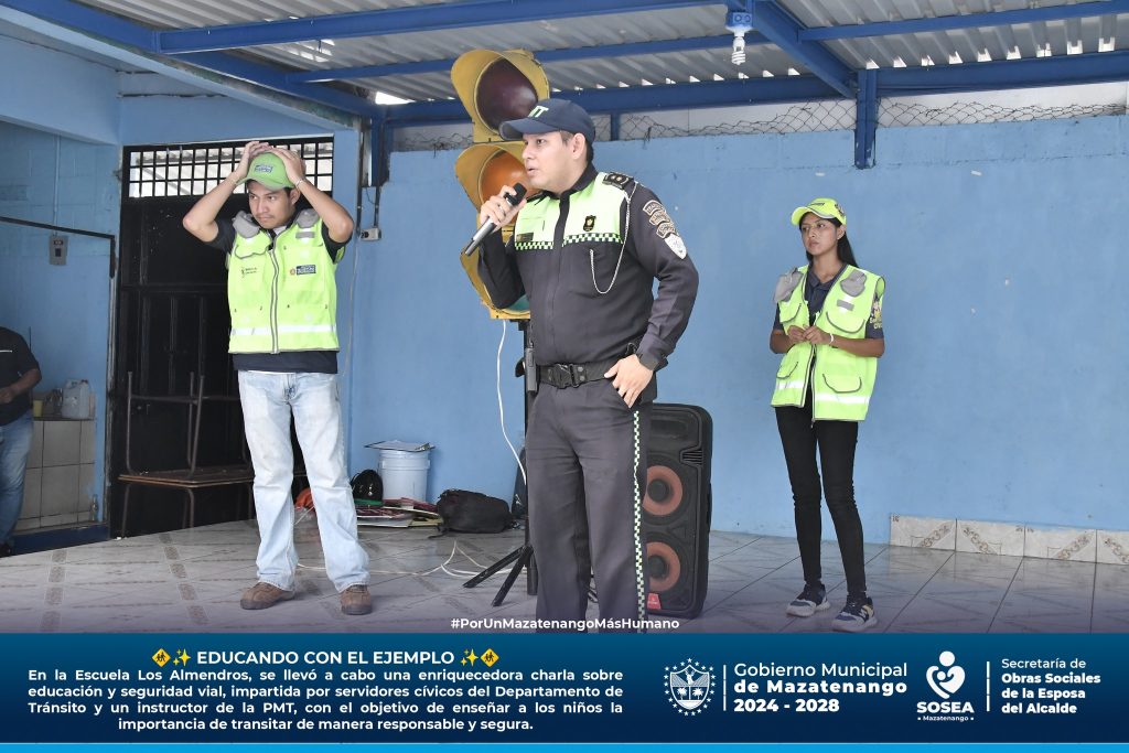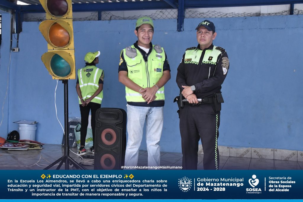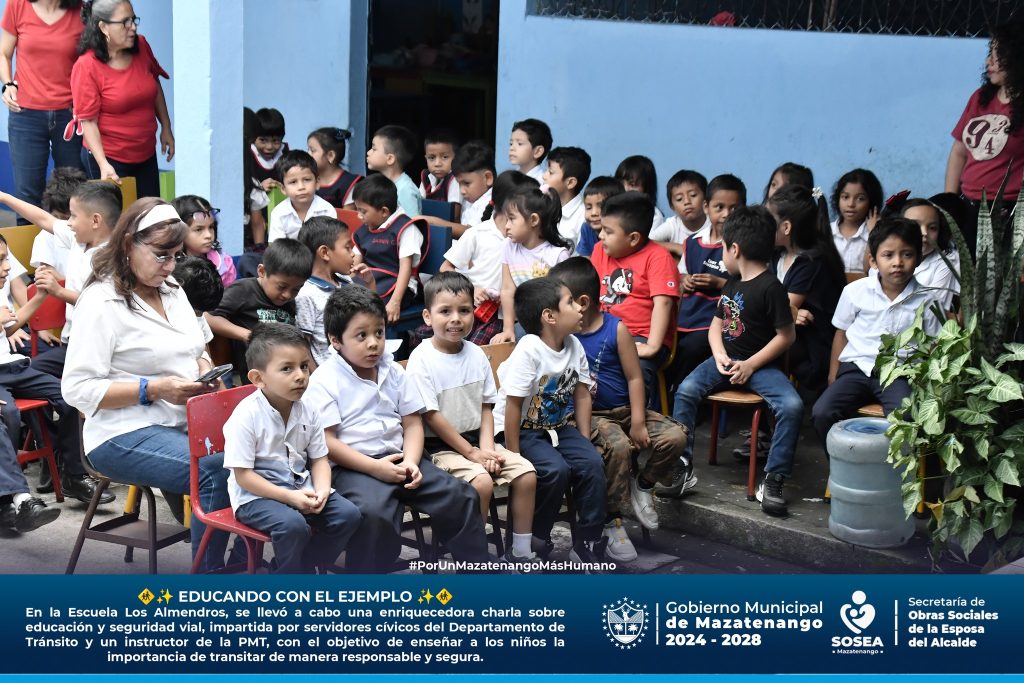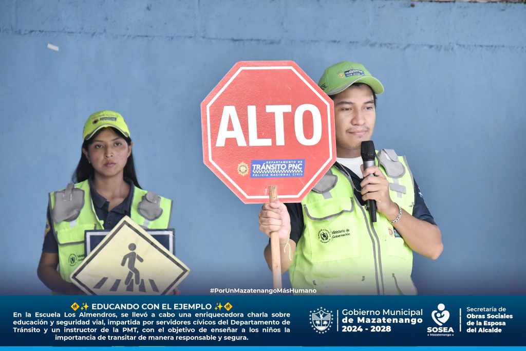 En la Escuela Los Almendros, se llevó a cabo una enriquecedora charla sobre educación y seguridad vial, impartida por servidores cívicos del Departamento de Tránsito y un instructor de la PMT, con el objetivo de enseñar a los niños la importancia de transitar de manera responsable y segura.