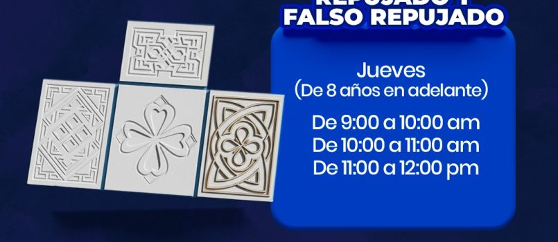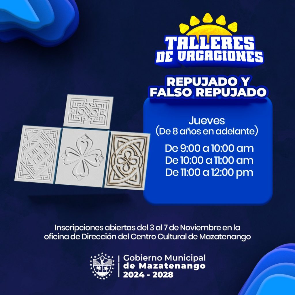 La Municipalidad de Mazatenango, a través del Centro Cultural de Mazatenango, invita a todos los pequeños artistas a participar en el Curso Vacacional de Repujado y Falso Repujado, donde podrán aprender técnicas creativas para dar textura, relieve y vida a sus diseños.